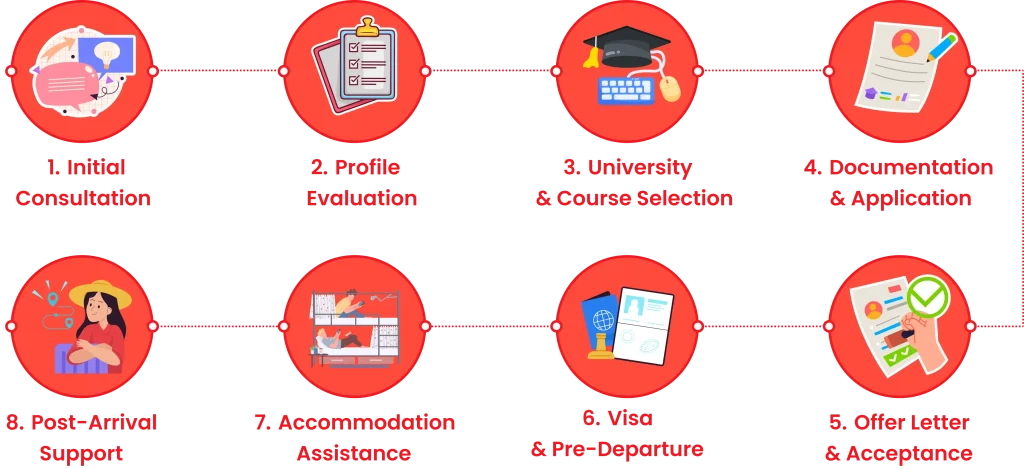 Individual goals vary with individuality among students. In order to properly understand the student's academic profile, preferences, and career objectives, our counselors engage in one-on-one consultations. It is upon this personalized requirement that we build our structure for successfully advising would-be candidates interested in studies abroad.